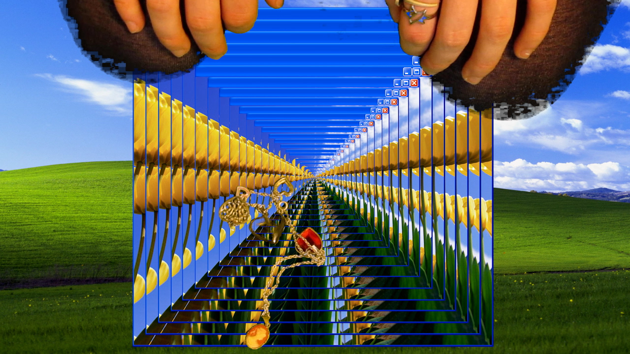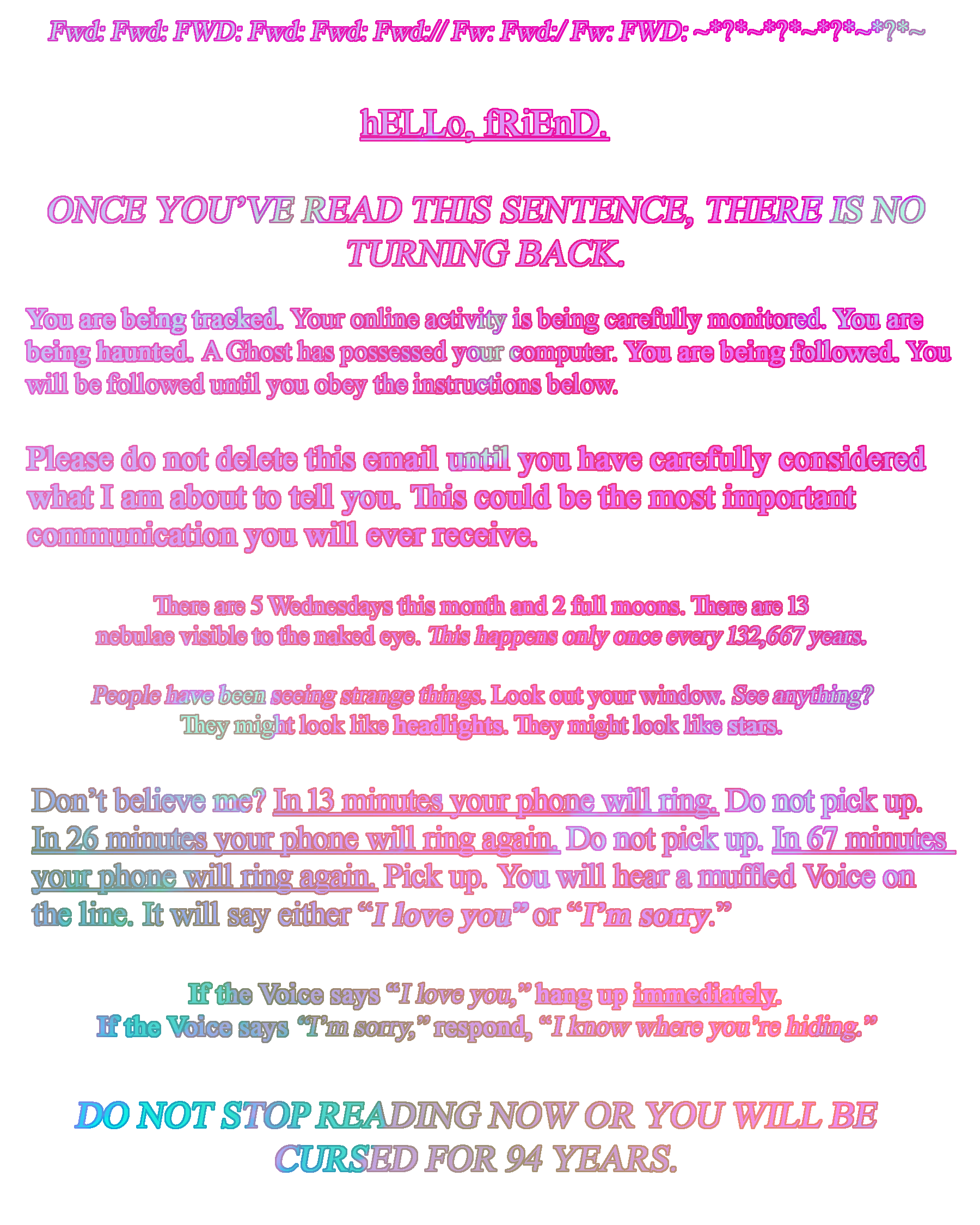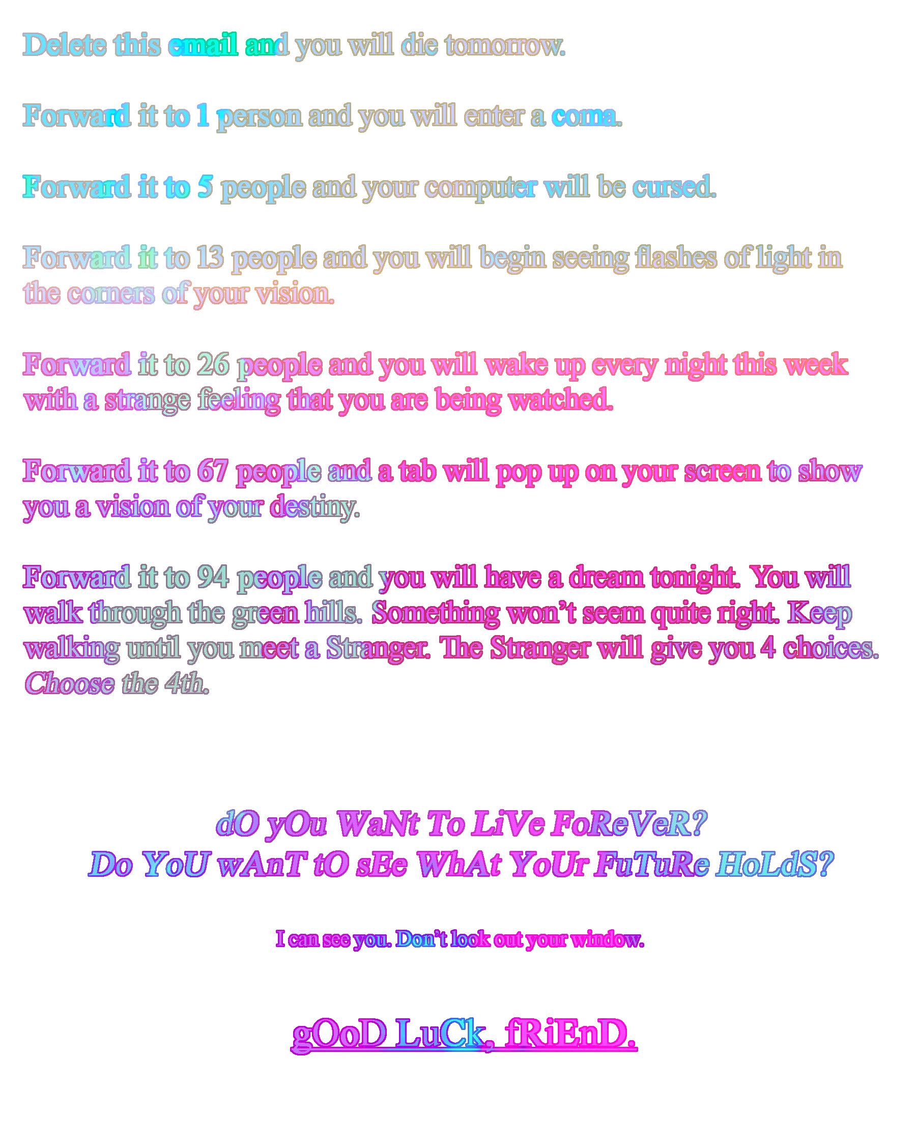 I'd describe the visual style of Strange Machines as digital-kitsch. My cluttered, maximalist style lends itself well to online viewing, as the viewer can pause it and skip around at their own pace if they'd like to see the details. One video is modeled after Youtube lyric videos people made in the 2000s. It seemed as if the creators didn't even bother to watch them after they were finished editing - you'd rarely find one without typos and misheard lyrics. The videos always ended with a disclaimer that they didn't intend copyright infringement as if this would grant some kind of immunity. I also wrote my own chainmail in the spirit of the ones kids used to email between friends and classmates. Before the internet, physical chainmail letters were generally pyramid schemes intended to scam vulnerable people and take their money. In the 2000s, they became something more innocent and playful, claiming to grant the reader good luck if they passed the email along or curse them if they deleted it. Kids shared these the same way they shared horror stories at a slumber party.