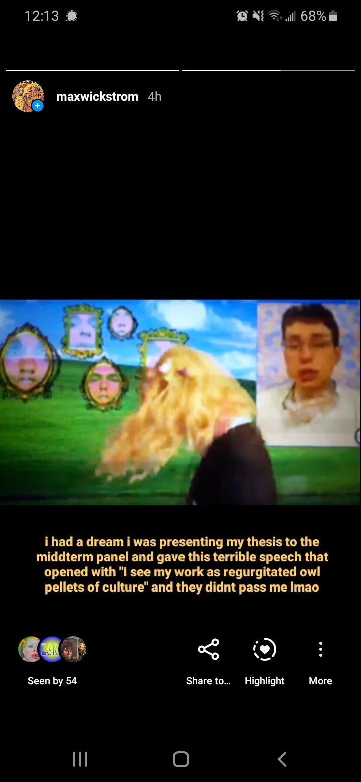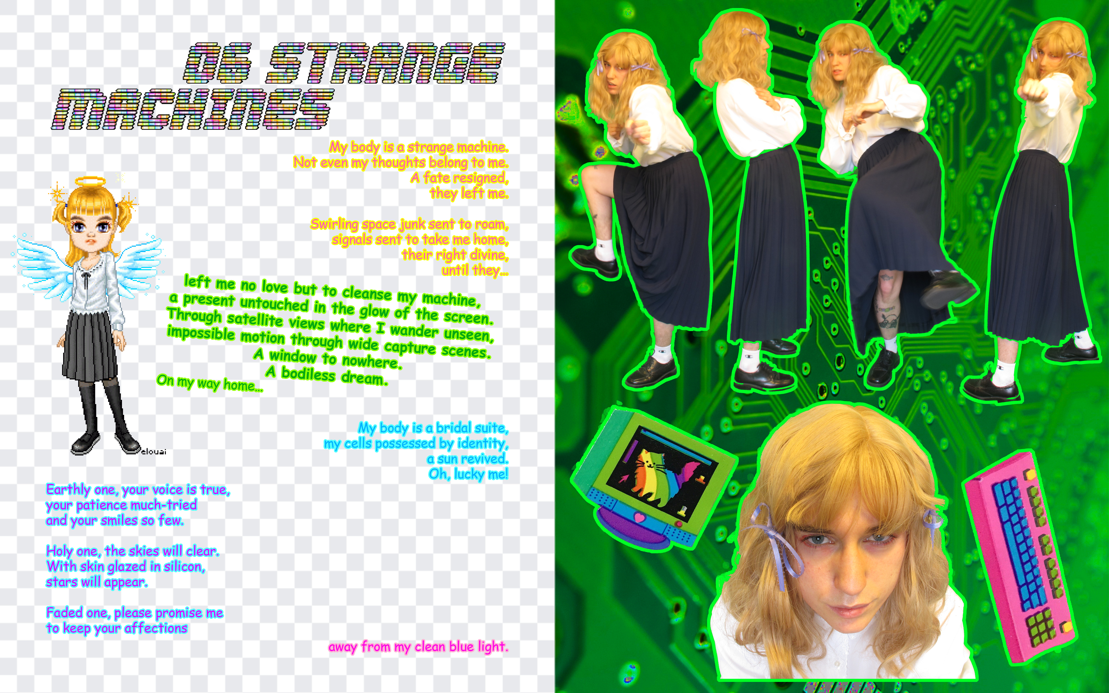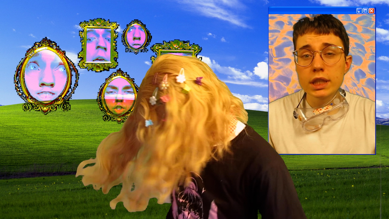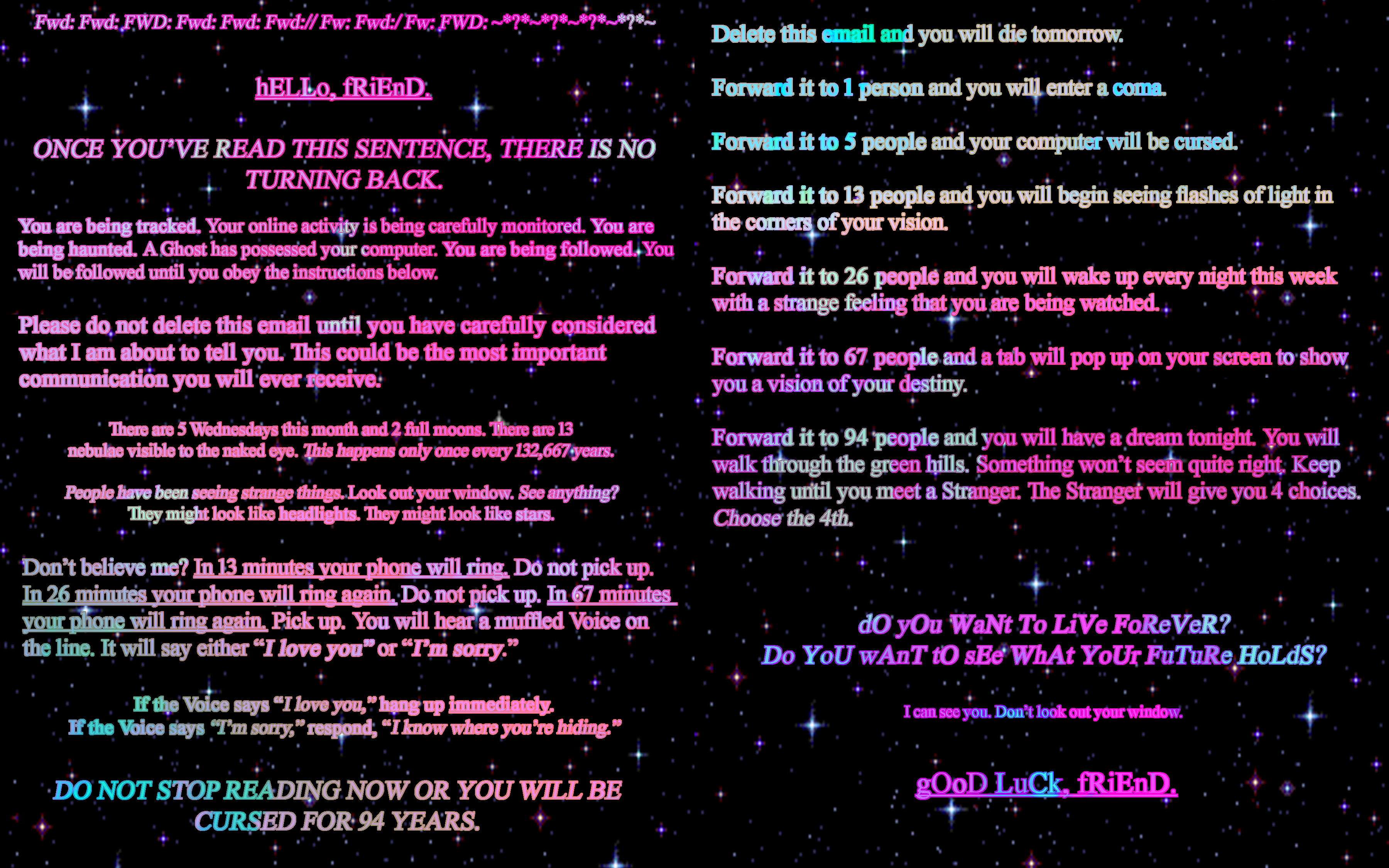 I'd describe the visual style of Strange Machines as digital-kitsch. My cluttered, maximalist style lends itself well to online viewing, as the viewer can pause it and skip around at their own pace if they'd like to see the details. One video is modeled after Youtube lyric videos people made in the 2000s. It seemed as if the creators didn't even bother to watch them after they were finished editing - you'd rarely find one without typos and misheard lyrics. The videos always ended with a disclaimer that they didn't intend copyright infringement as if this would grant some kind of immunity. I also wrote my own chainmail in the spirit of the ones kids used to email between friends and classmates. Before the internet, physical chainmail letters were generally pyramid schemes intended to scam vulnerable people and take their money. In the 2000s, they became something more innocent and playful, claiming to grant the reader good luck if they passed the email along or curse them if they deleted it. Kids shared these the same way they shared horror stories at a slumber party.