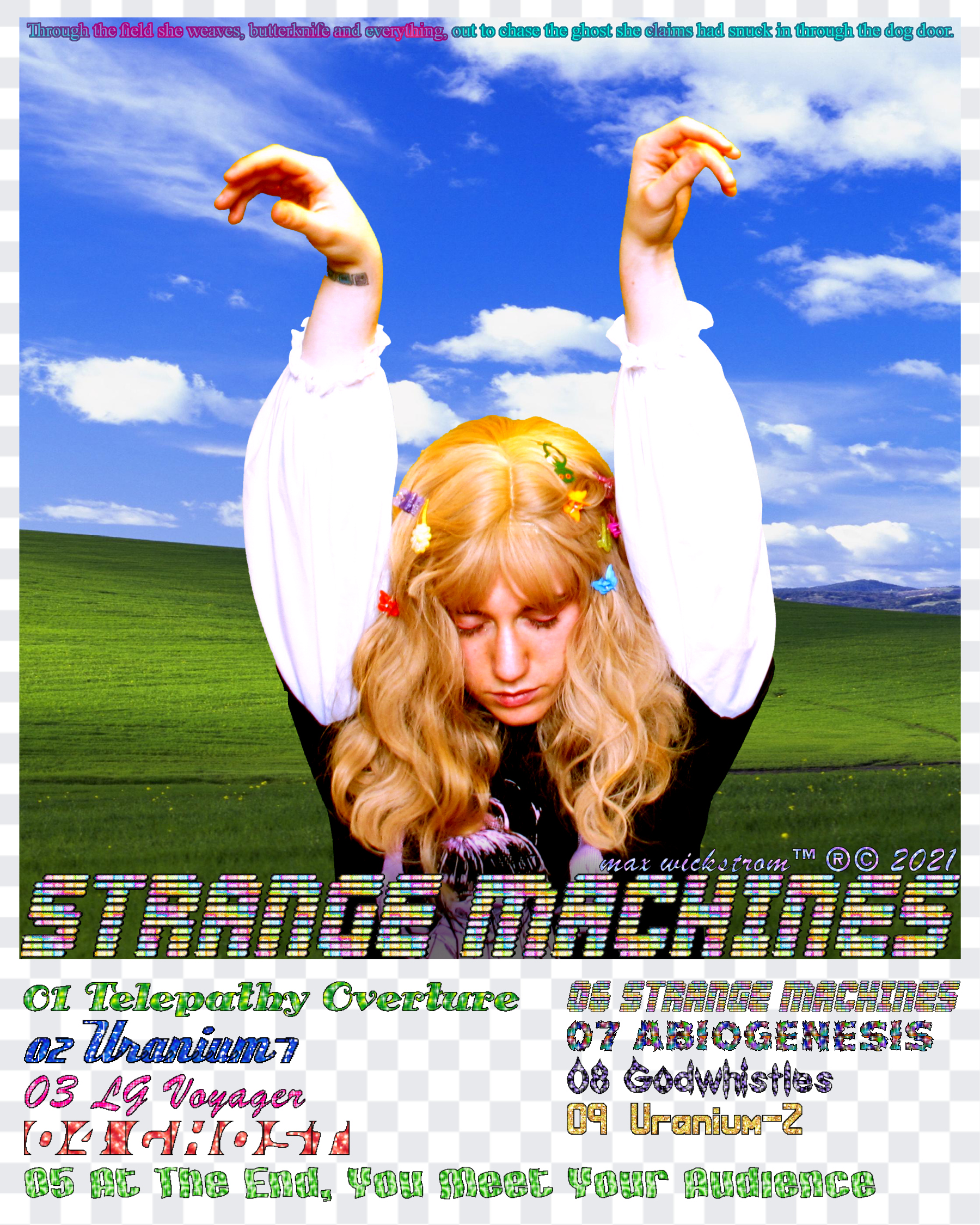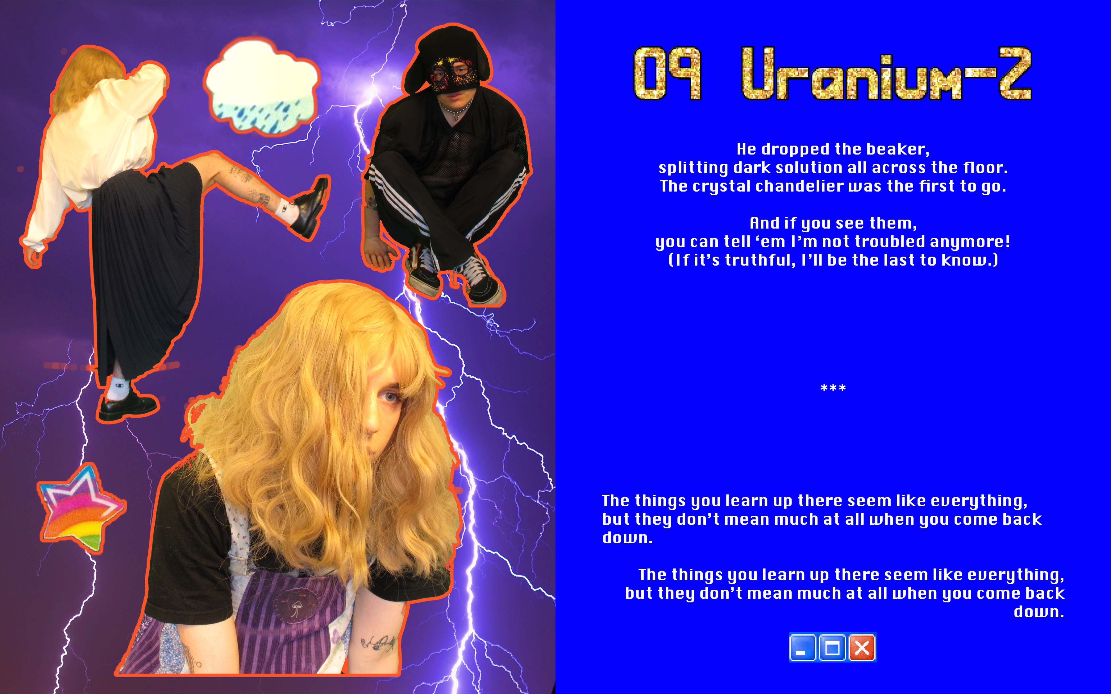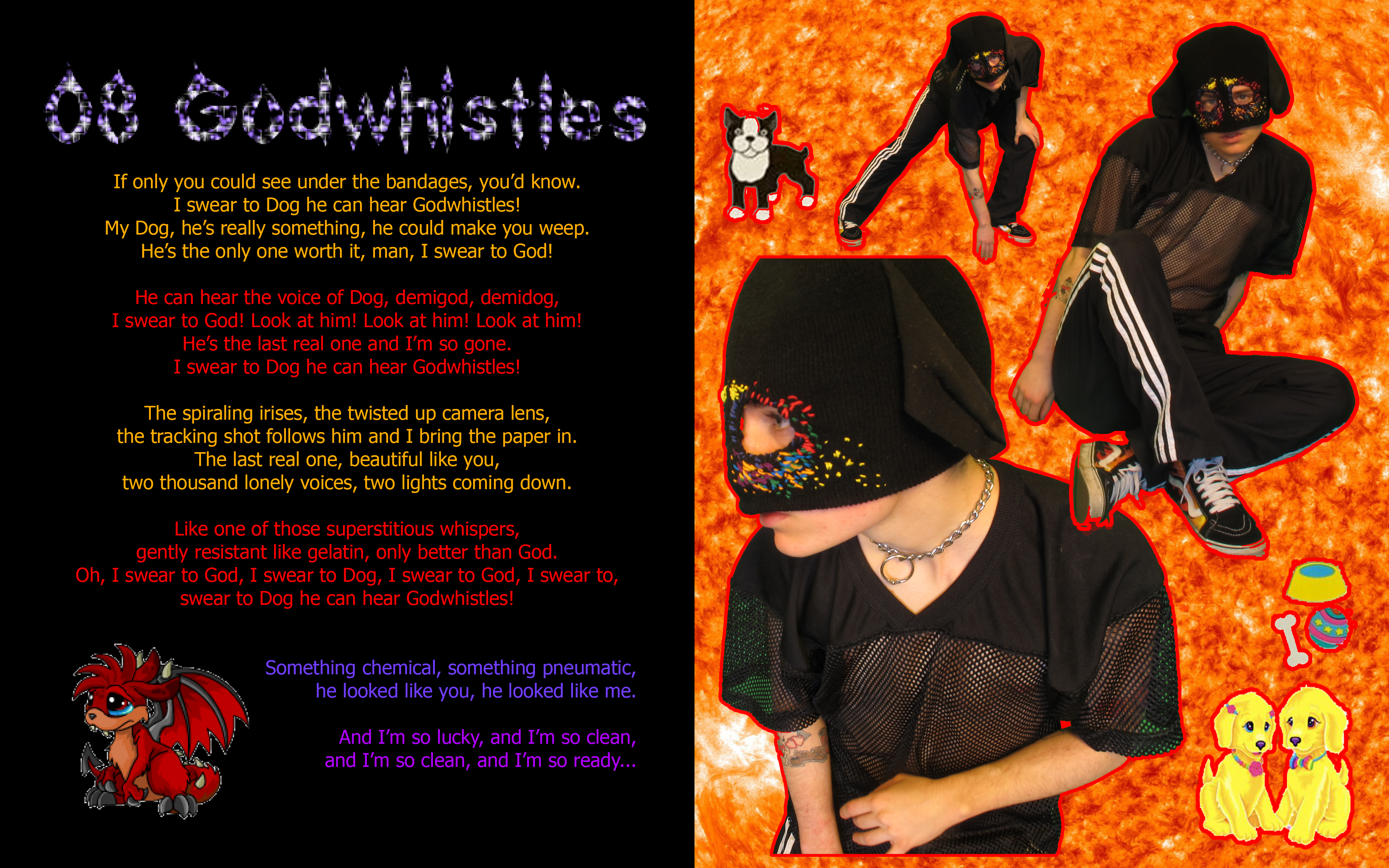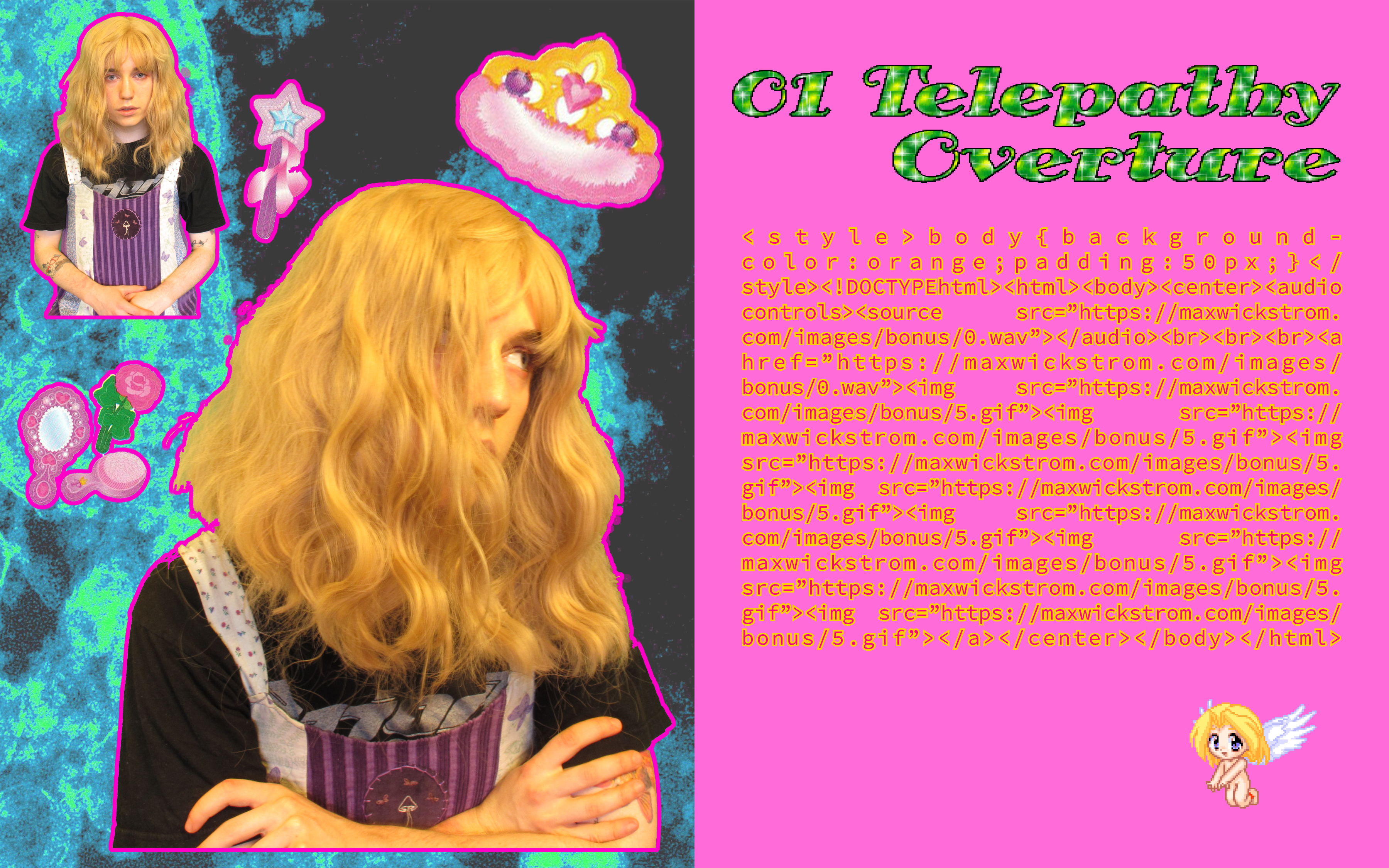 Some of my lyrical themes are more serious, but I want the project to have an offbeat humor. I think there's a specific place of vulnerability I aimed for. When you claim a piece of art is ironic and purposely bad, it automatically puts up a wall of defense between you and your audience that makes the work untouchable and removed from critique. It's tempting to spare yourself from the humiliation you risk every time you express yourself through art, but I tried to honor the things I liked and the emotions I had as a kid without satire or judgement. I think using stock photos, garish fonts, and giving uncomfortably awkward performances could easily veer the project into a jaded irony, but I intend it to be very sincere, even if that could subject me to some embarrassment. Instead of a disparaging parody, it's an empathetic celebration of my childhood fantasies of emulating the musicians I idolized and the curiosity and fun I had using the early internet. Hope you enjoy! :)