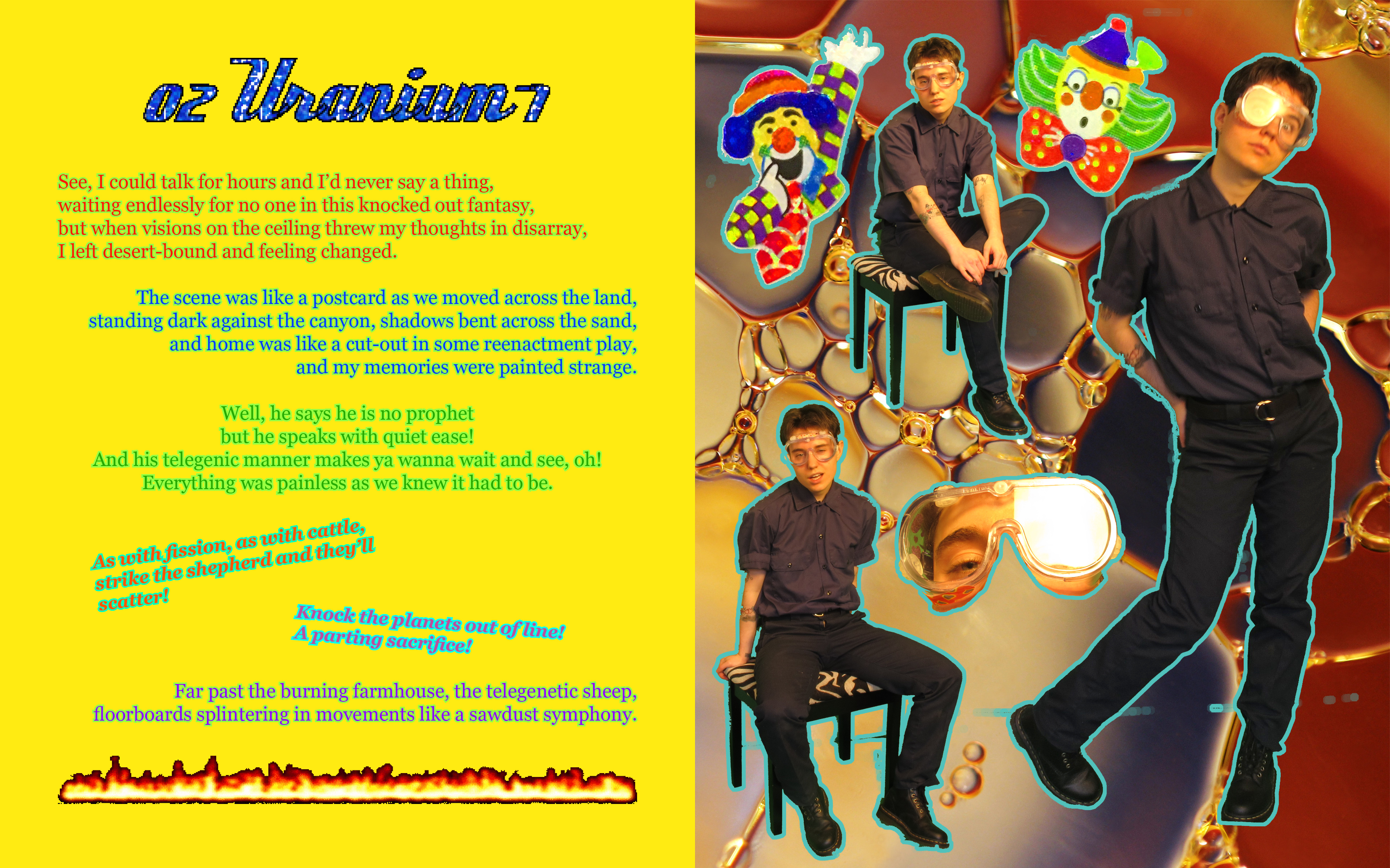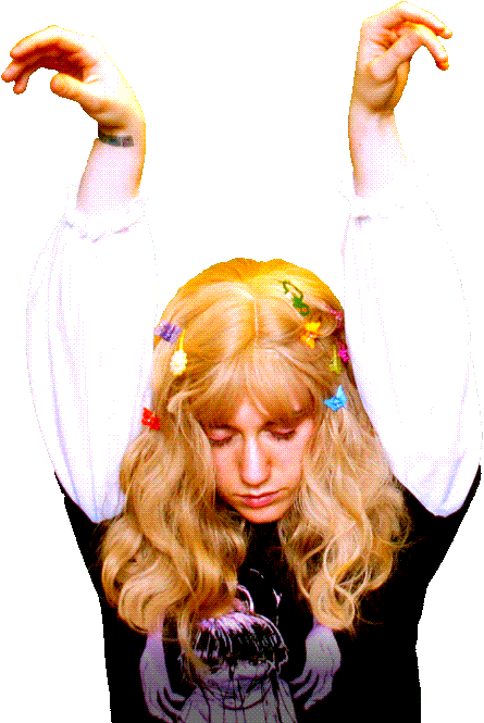 I recorded the album in my apartment with a Shure SM58 mic and mixed everything using Audacity. I played my Fender Squier through a Super Chorus pedal and a small Fender amp and heavily processed/layered the sound using Audacity's built-in effects. The Arturia Minibrute drum machine and the Eurorack modular synth systems I used were borrowed from PCC. Some digital drum samples were taken from this free collection from Reverb and a couple drum tracks were made in Ableton at PCC. I filmed the videos with a Canon Powershot G-12 in front of a haphazardly built green screen in my apartment and edited them at PNCA using Adobe Premiere. All the animated gifs were taken from archive.org's GifCities archive* and the pop-up ads in "Uranium-2" are from this blogger's archive. Some of the video backgrounds were distorted with Photomosh. The album's title text and glitter text headings were made with Picasion. The pixel dolls were made on eLouai.