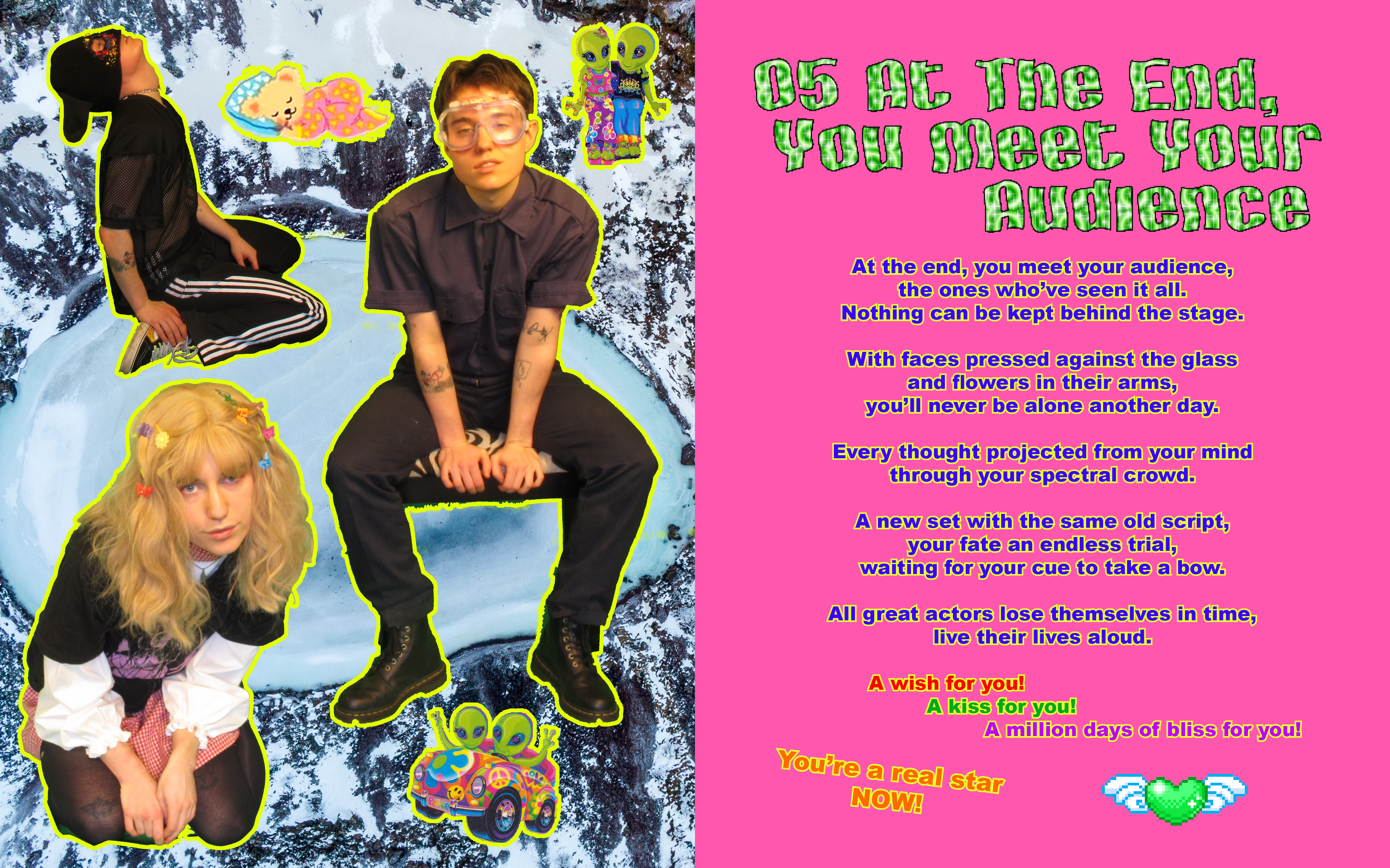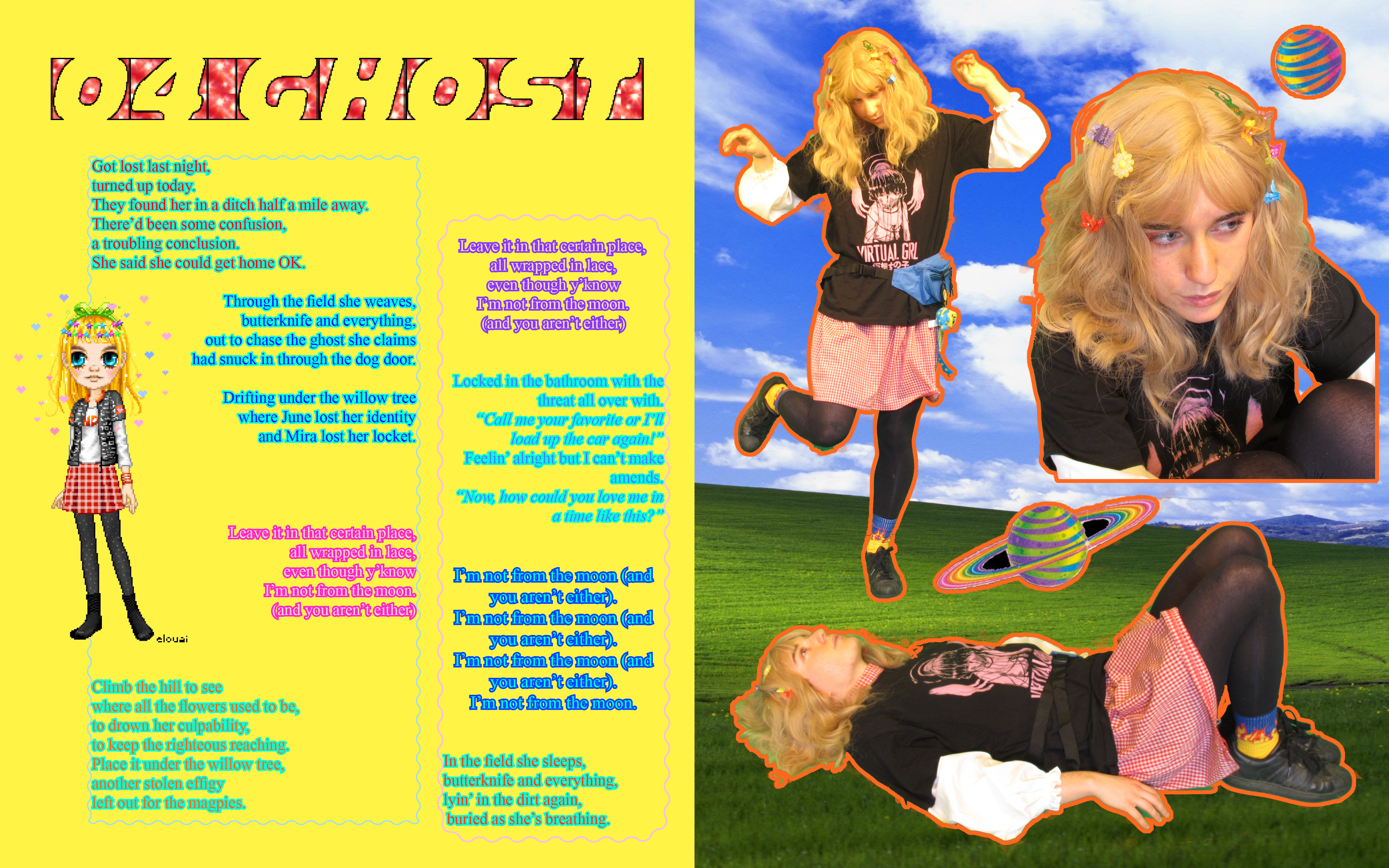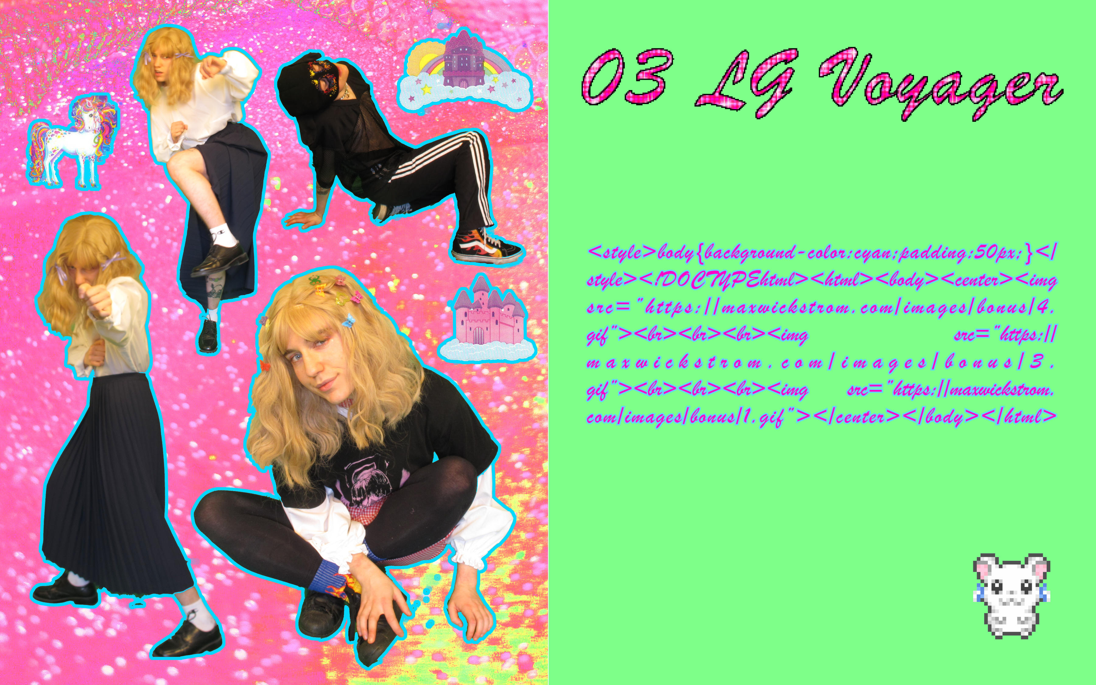 I see the project as a time capsule of both the decade that inspired it and the decade I made it in. It's as much about 2000s digital aesthetics as it is my generation's obsession with that era in the 2010s and ‘20s. It clearly wasn't actually created in the early days of the internet - I'm guessing in a few years it'll be pretty obvious to people that it was made by a Gen Z member in 2021. We cringe at the things young people post online, but I think there's something beautiful about creating media you know will become very dated. There's such a pressure to be "original" and "ahead of your time" when really, I don't think there's anything wrong with taking inspiration from the pop culture you love. In the same way I feel about the art I made in the 2000s, I like the idea of looking back at what I was doing in 2021 and feeling a little embarrassed by my creative decisions.